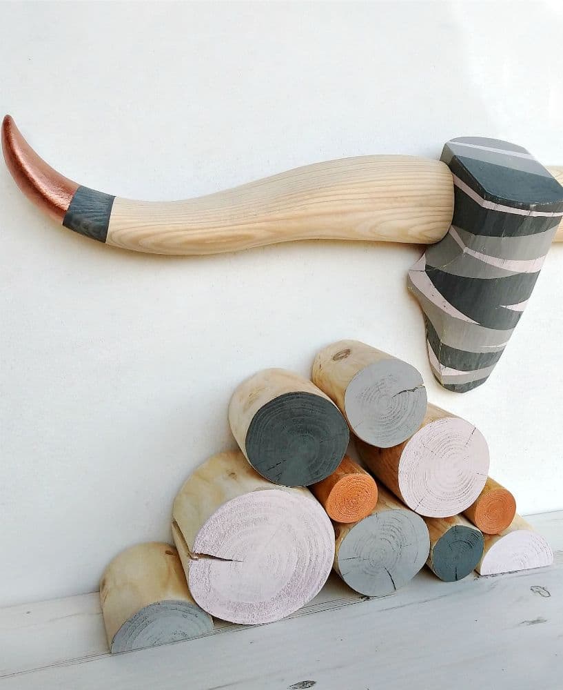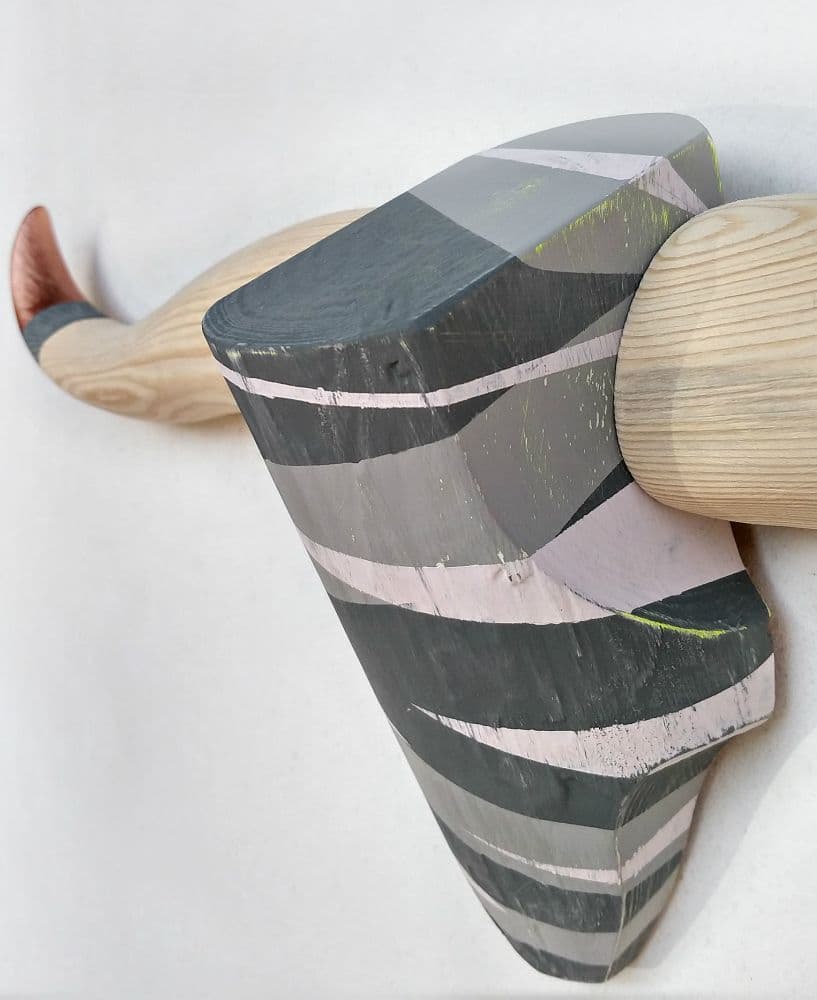 This bull's head has been hand crafted in our workshops using timber that has been sourced locally, from within the Royal Forest of Dean. The camouflage pattern involves our 'Mist' Colour Mix palette, incorporating light- and mid-grey with pale pink and a beautifully rich copper lustre. The painted surface has been distressed to reveal just a hint of vivid yellow in small areas. The natural wood horns have been edged with a mid-grey stripe (also distressed) and a metallic copper finish on the tips.