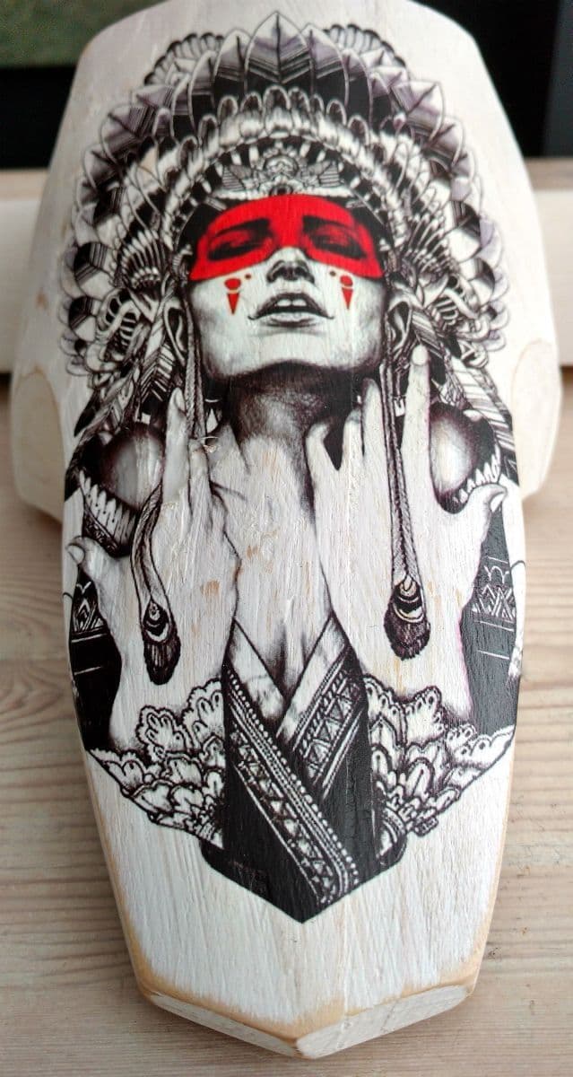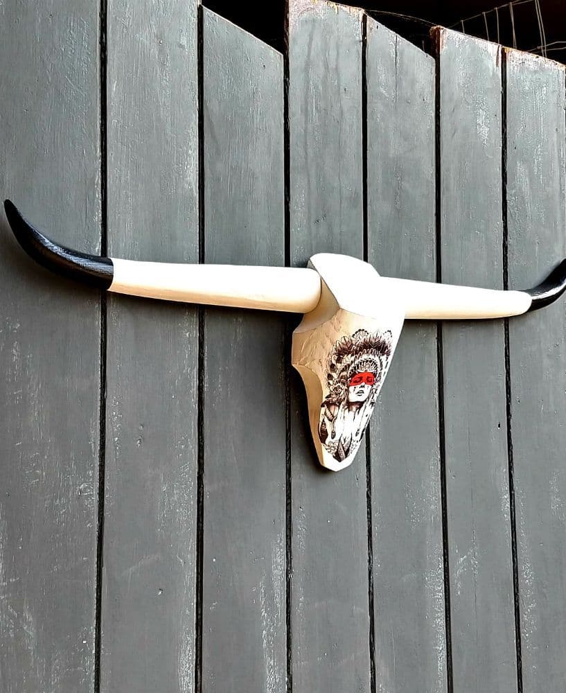 This unique Cattle Skull wall decoration features a beautiful, tattoo-style black illustration of a woman wearing a fabulous Red Indian-style headdress/crown that's bursting with feathers; her red mask provides a striking accent colour. In keeping with the strong design, we've added luscious black satin-finish tips to the long horns.